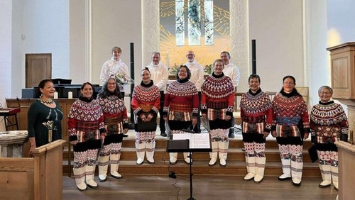 Koret Aavaat deltager i højmessen med grønlandske salmer , og de synger mere i forbindelse med frokosten bagefter.